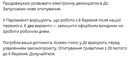 "В парламенте решают, что делать с 8 марта после нашей победы. Есть два варианта - оставить официальным выходным или сделать рабочим днем", - отметил он.