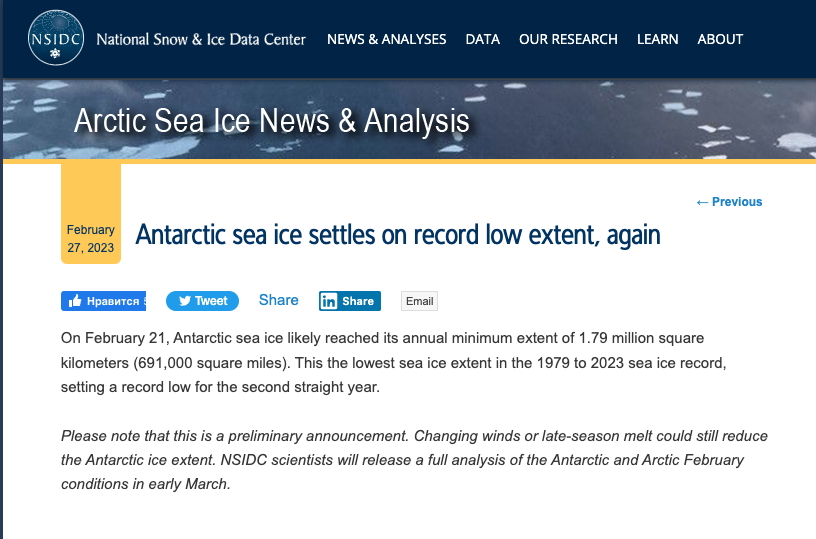 Антарктический морской лед растаял до минимума за последние 45 лет - до 1,79 млн квадратных км. При том антирекорд устанавливается второй год подряд.