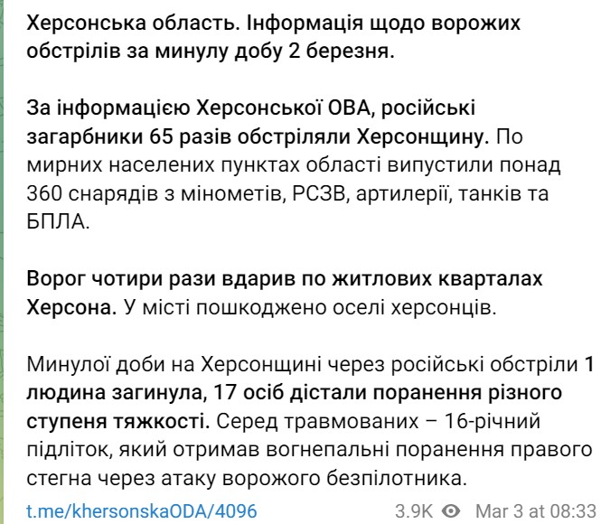 За минувшие сутки войска РФ 65 раз обстреляли территорию Херсонской области. Они выпустили более 360 снарядов из минометов, РСЗО, артиллерии, танков и дронов.