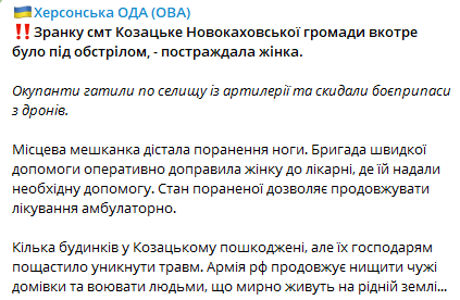 Утром в понедельник, 6 марта, российские войска обстреляли пгт Казацкое Новокаховской громады Херсонской области. Есть раненая.