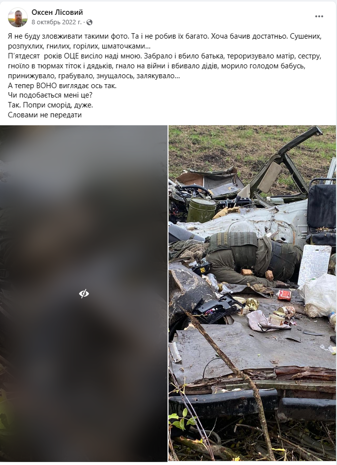 "Пятьдесят лет ЭТО висело надо мной. Забрало и убило отца, терроризировало мать, сестру, гноило в тюрьмах теток и дядей, гнало на войны и убивало дедов, морило голодом бабушек, унижало, грабило, издевалось, запугивало… А теперь ОНО выглядит так. Нравится ли мне это? Да. Несмотря на вонь, очень. Словами не передать", - писал Лисовой.