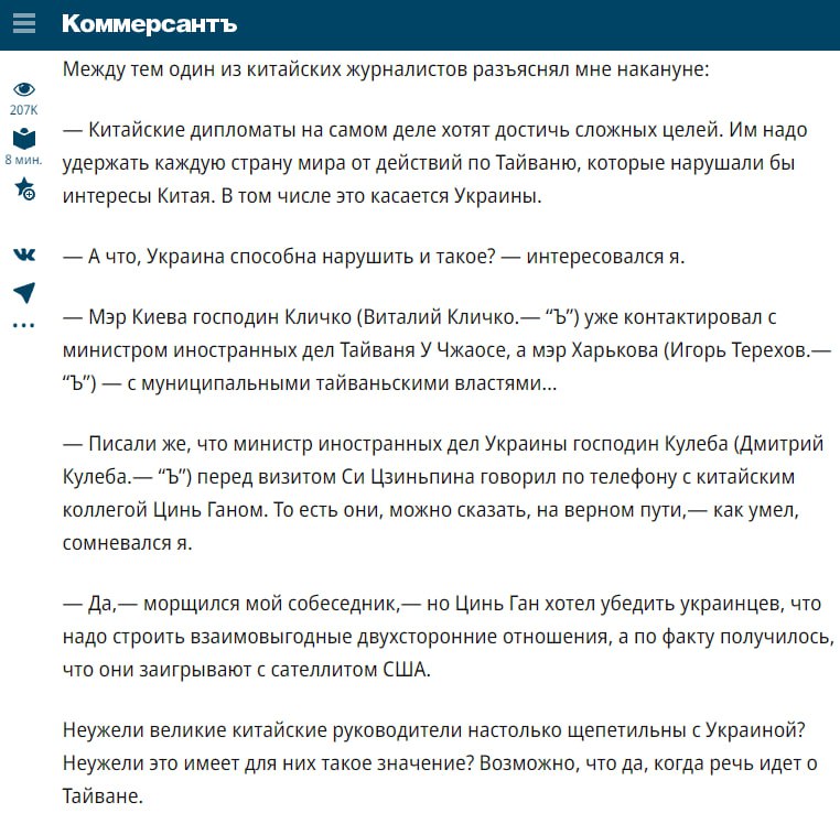 В Китае опасаются, что Украина начнет оказывать поддержку Тайваню - Коммерсант