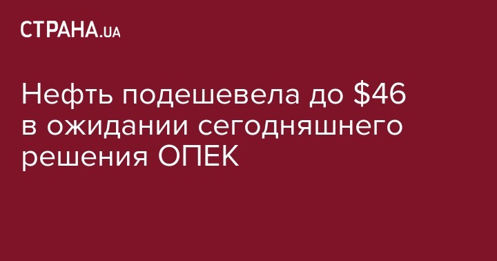 На Интерконтинентальной бирже стоимость январских фьючерсов на нефть марки Brent утром подешевела на 2,857% — до $46,90 за баррель. Цена на нефть марки WTI упала на 3,359% и составила $45,55 за баррель.