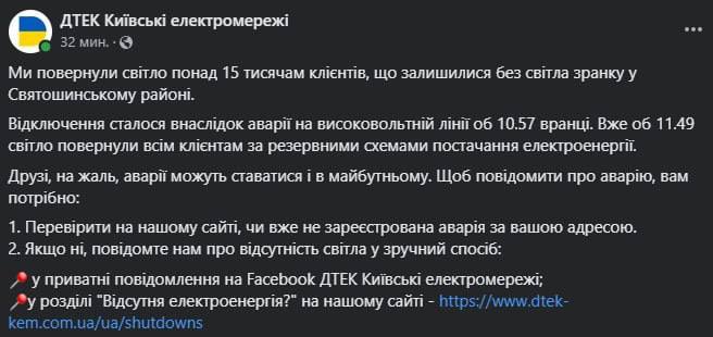 15:07 Причиной отключения света, о которой писали утром киевские телеграм-каналы была авария на высоковольтной линии электропередач, сообщили в ДТЭК.