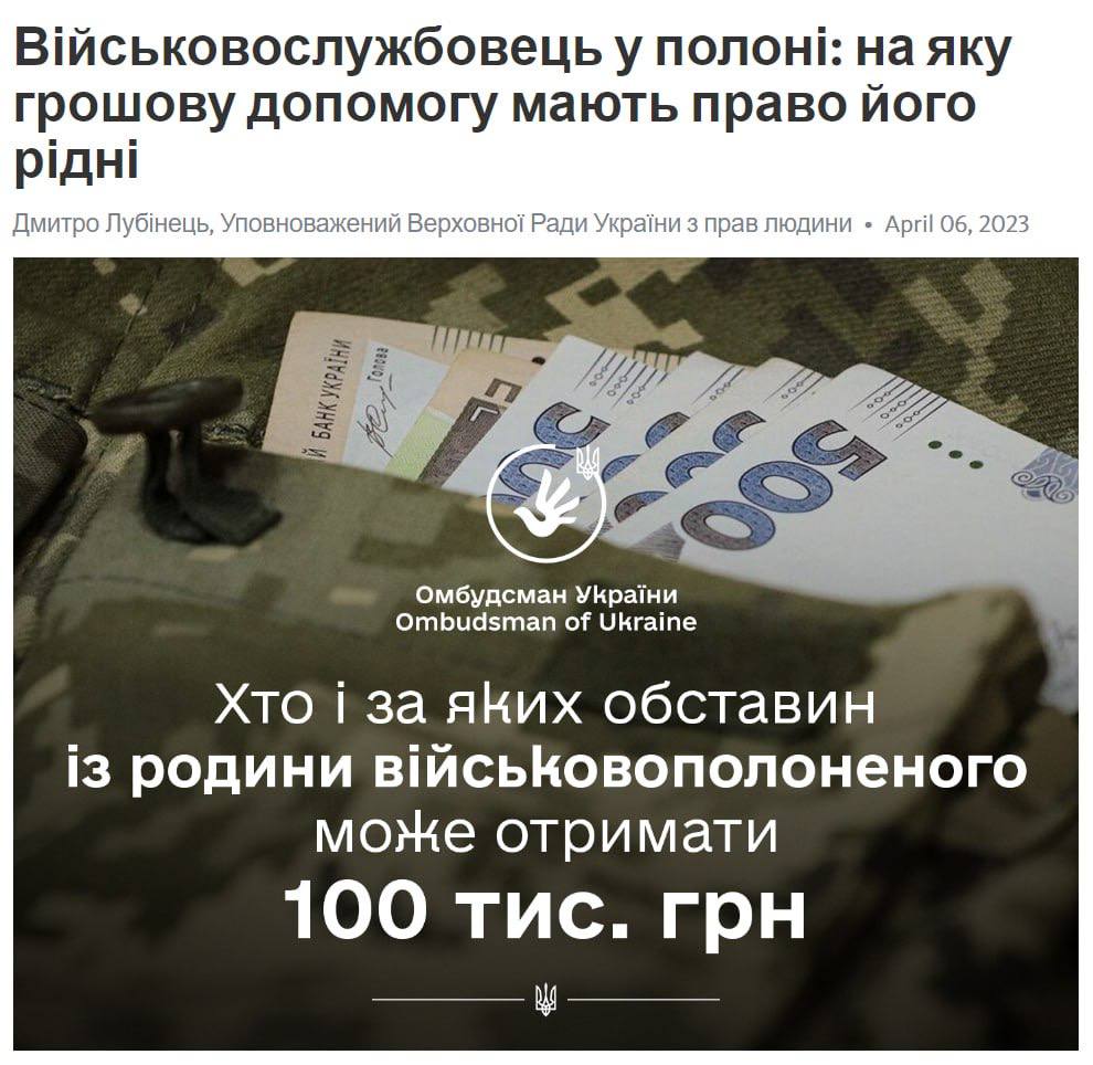 Украинский омбудсмен Дмитрий Лубинец объяснил, кто из семьи военнопленного и при каких обстоятельствах может получить 100 тысяч гривен.
