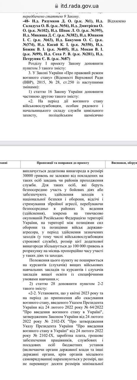 "Законопроект 8312. Во время обсуждения ко второму чтению на голосование была поставлена правка, предусматривающая возврат выплат 30 тысяч военнослужащим, службе гражданской защиты, полицейским. Правка получила 254 голоса, сам закон - 277", - сообщил источник "Страны".