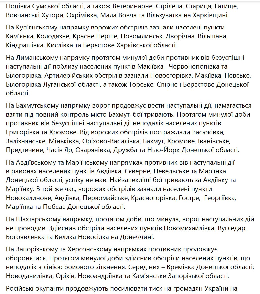На Бахмутском направлении продолжаются бои за Бахмут (противник пытается установить на ним полный контроль), а также села Григоровка и Хромово.