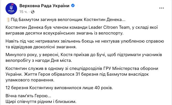 07.49 Под Бахмутом погиб украинский велогонщик Константин Денека, который служил в спецподразделении Главного управления разведки Минобороны. Ему было 40 лет.