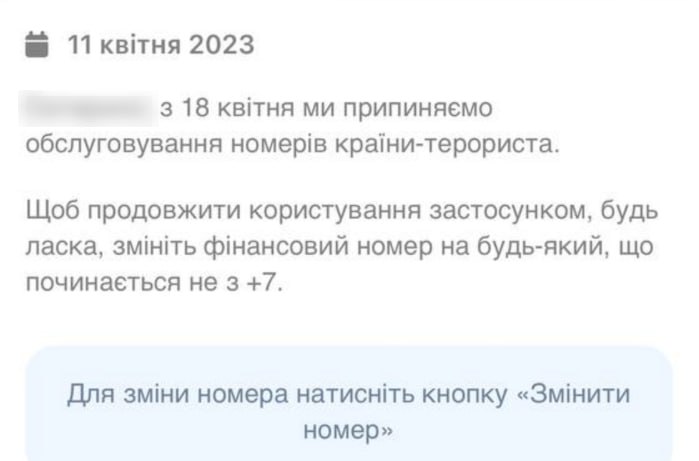 "18 апреля мы прекращаем обслуживание номеров страны-террориста. Чтобы продолжить пользоваться приложением, пожалуйста, смените финансовый номер на любой, который начинается не с +7", - говорится в сообщении.