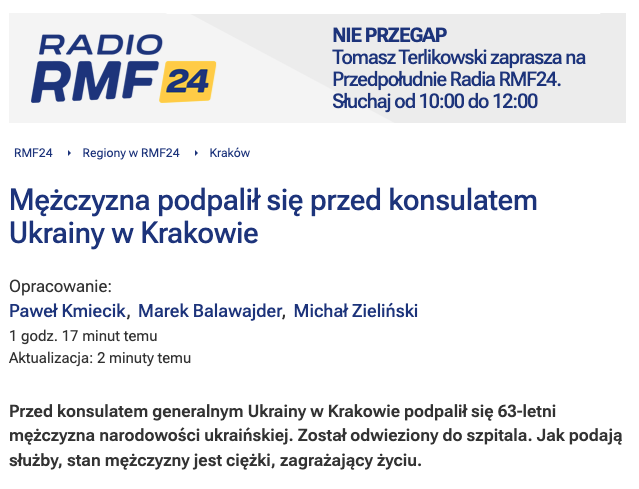 Под зданием генконсульства Украины в Кракове 62-летний украинец попытался совершить самосожжение. Мужчина выкрикивал в адрес собравшихся под генконсульством призывы на украинском языке возвращаться на родину и защищать страну от россиян.