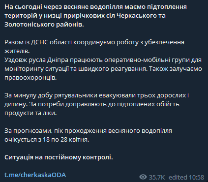 Также в соседней Черкасской области подтоплены села Черкасского и Золотоношского районов, сообщил губернатор Игорь Табурец.