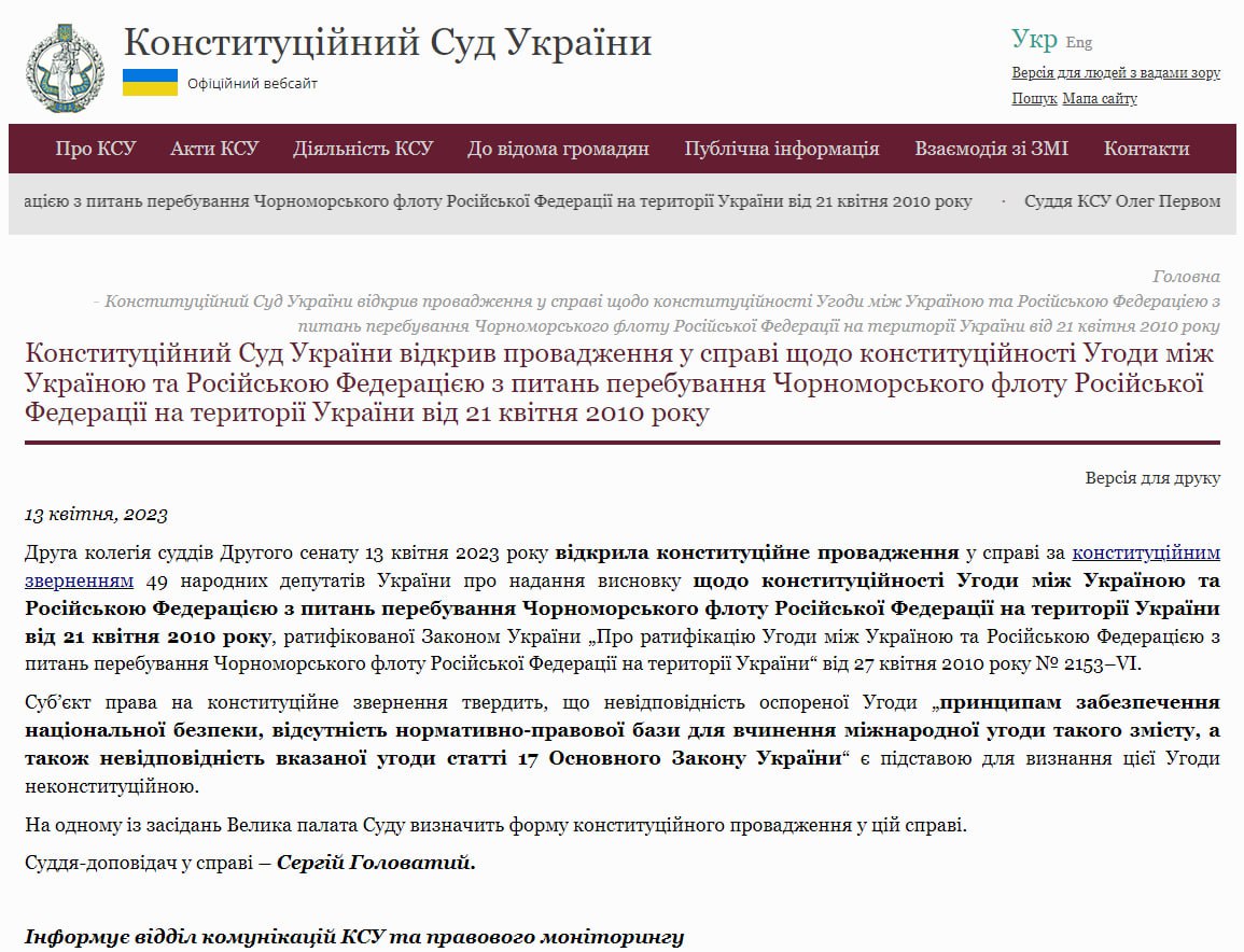 Ранее в КС поступило представление от 49 народных депутатов Украины, чтобы суд проверил конституционность "Харьковских соглашений".