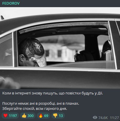"Когда в интернете снова пишут, что повестки будут у Дие. Услуги нет ни в разработке, ни в планах", - подписал фото Федоров.