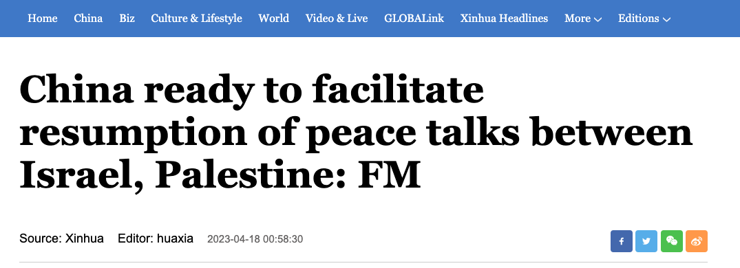 Китай предложил свое посредничество для мирных переговоров Израиля и Палестины