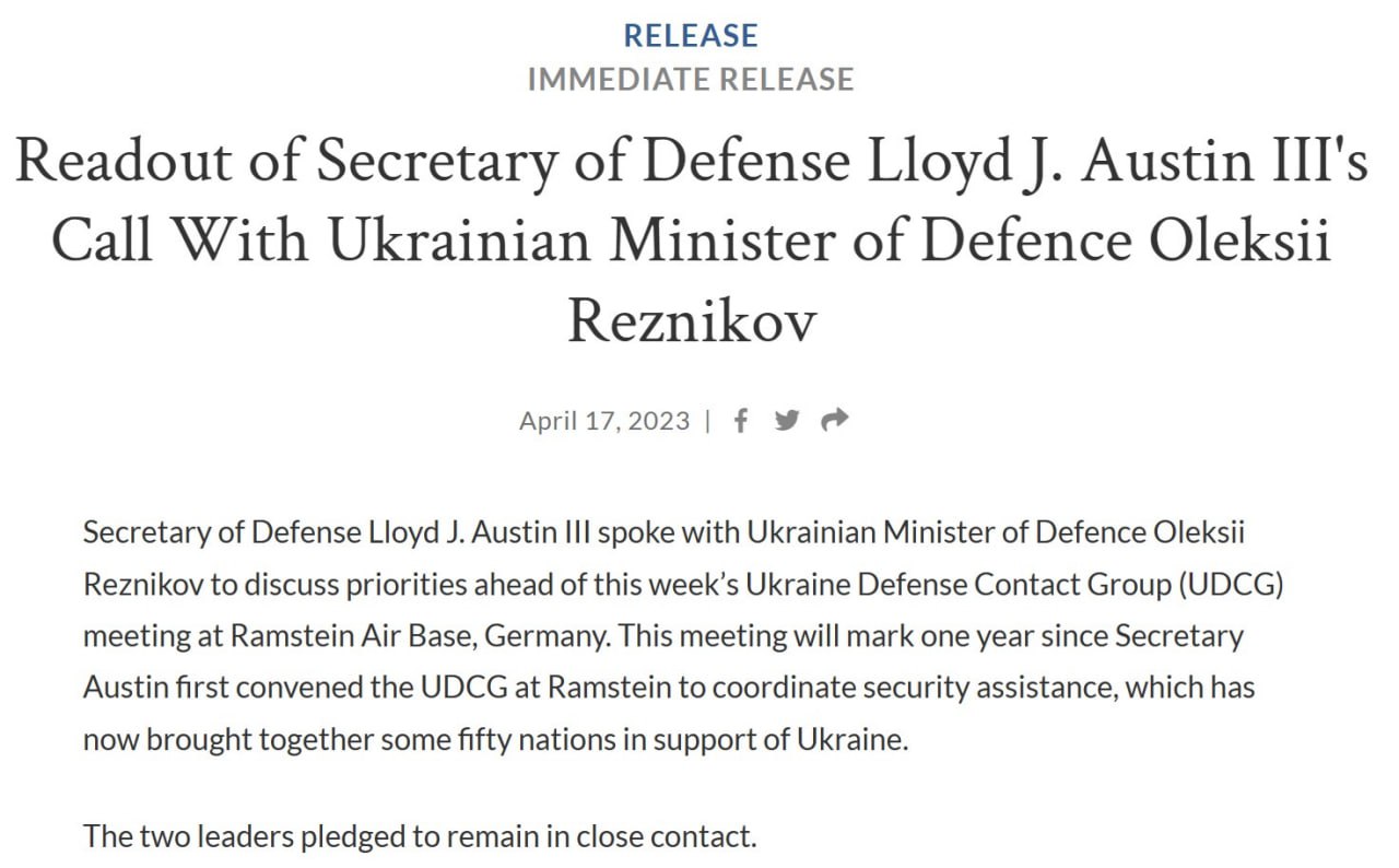 Как сообщает сайт Пентагона, Резников и Остин "обсудили приоритеты" перед встречей Контактной группы, которая состоится на этой неделе на авиабазе Рамштайн в Германии.