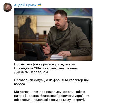 А Ермак сообщил, что с Салливаном они "обсуждали ситуацию на фронте и характер действий врага".