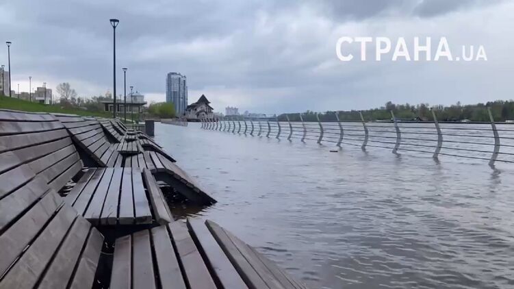 В Киеве снова затопило набережную со скамейками. Видео