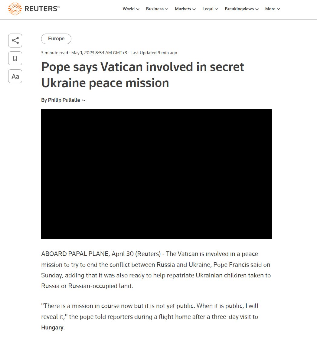 Папа Римский заявил, что Ватикан причастен к "секретной миротворческой миссии в Украине".