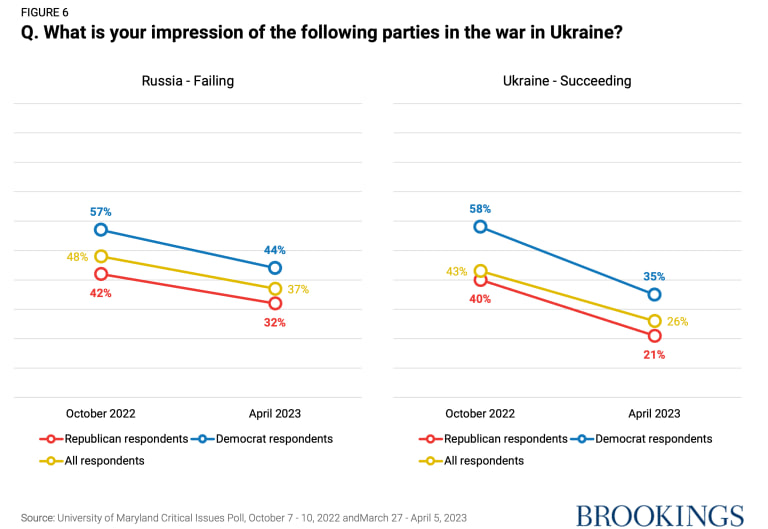 Тем временем социологи отмечают снижении поддержки вооружения Украины в западном обществе. Свежее исследование университета Мэриленда и компании Ipsos показывает, что поддержка Украины в США падает, и это "должно беспокоить американских политиков", считает Институт Брукингса.