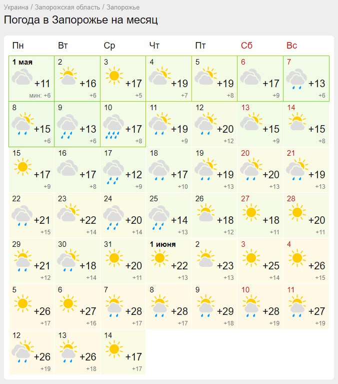 В прифронтовом Запорожье май обещает быть достаточно дождливым на всей протяженности месяца: осадки разной интенсивности предполагаются каждую неделю по 2-3 дня. Наиболее сухой будет первая неделя месяца: там дождь ожидается только в воскресенье, 7 мая.