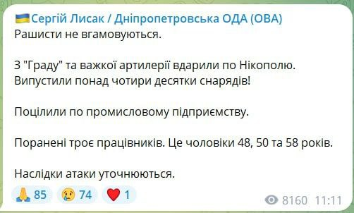 Попали по промышленному предприятию. Ранены трое работников – мужчины 48, 50 и 58 лет. Другие последствия атаки уточняются, пишет Лысак.