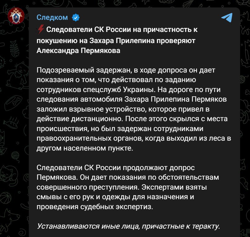 "На дороге по пути следования автомобиля Захара Прилепина Пермяков заложил взрывное устройство, которое привел в действие дистанционно. После этого скрылся с места происшествия, но был задержан сотрудниками правоохранительных органов, когда выходил из леса в другом населенном пункте", - говорится в заявлении Следственного комитета.
