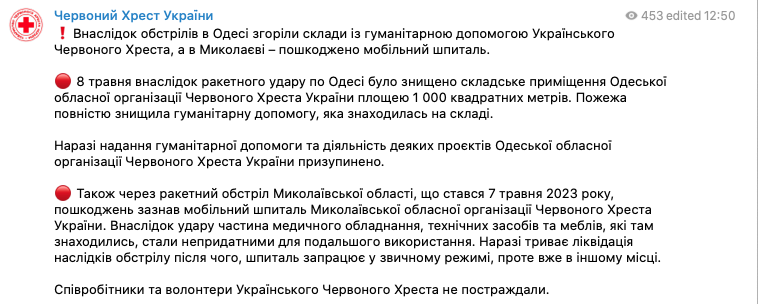 Из-за этого оказание гуманитарной помощи и деятельность некоторых проектов одесского филиала КК приостановлены.