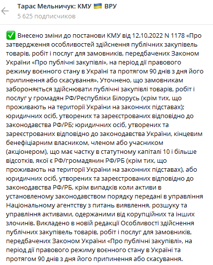 Также запрещается закупка товаров и услуг от украинских юридических лиц, где Российская Федерация или ее граждане являются конечными бенефициарами с долей в уставном капитале 10% и более, за исключением тех, кто проживает на территории Украины.