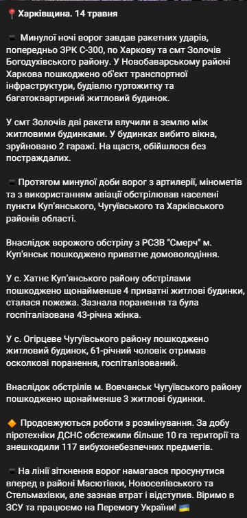 Кроме того, за прошедшие сутки враг из артиллерии, минометов и с использованием авиации обстреливал населенные пункты Купянского, Чугуевского и Харьковского районов области.