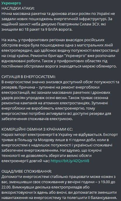 17.05 В энергосистеме Украины значительно снизился доступный объем мощности и резервов из-за ремонта энергоблоков электростанций, поэтому потребителям необходимо уменьшить потребление электроэнергии в вечерние часы – с 19.00 до 22.00, сообщает "Укрэнерго".