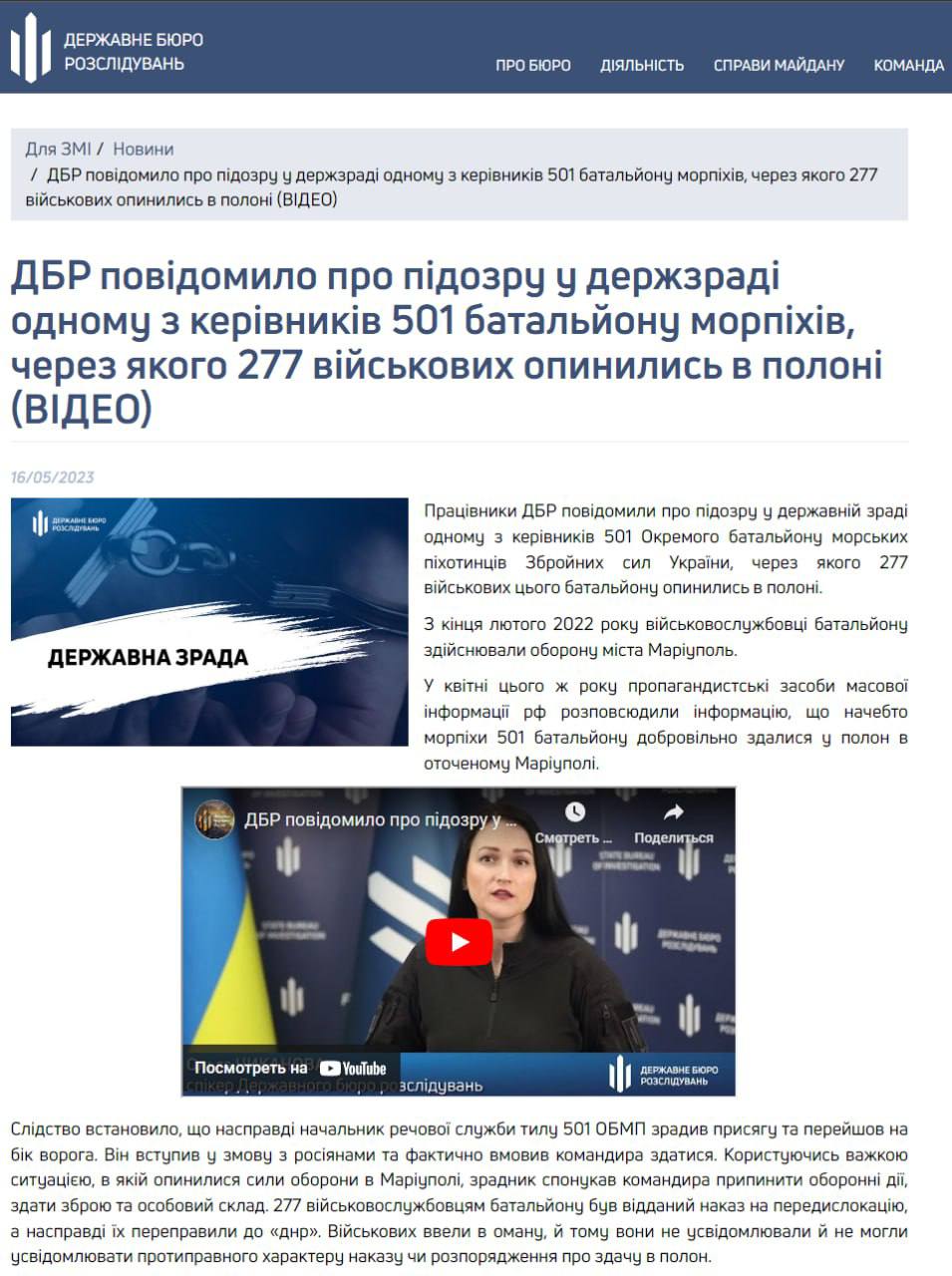 10.41 ГБР сообщило о подозрении в госизмене одному из руководителей 501 батальона морпехов, из-за которого, по версии следствия, 277 военных этой бригады оказались в плену.