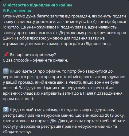 09.35 Украинцы жалуются в Минвосстановления, что не могут подать заявку на восстановления жилья, т.к. в "Дие" их жилье не отображается.