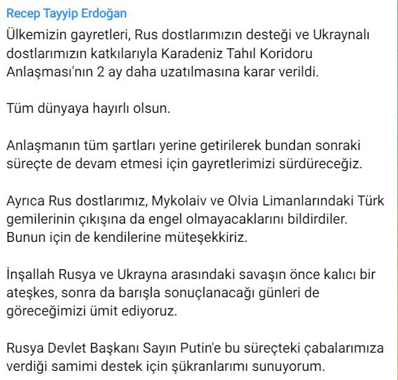 «Наши российские друзья заявили, что не будут препятствовать выходу турецких судов из портов Николаев и Ольвия», – написал Эрдоган.