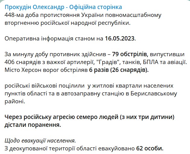 За минувшие сутки РФ 79 раз обстреляла Херсонскую область, выпустив 406 снарядов из тяжелой артиллерии, БПЛА, авиации и "Градов".