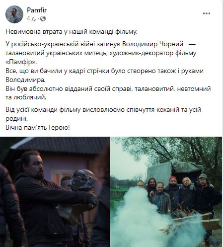 "Неописуемая потеря в нашей команде фильма. В российско-украинской войне погиб Владимир Черный - талантливый украинский художник, художник-декоратор фильма "Памфир". Все, что вы видели в кадре, было создано также и руками Владимира. Вечная память Герою!" - говорится на странице фильма в соцсетях.