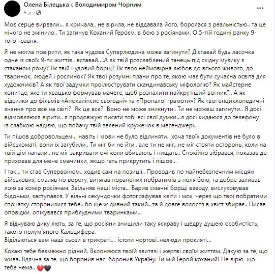 "Мое сердце вырвали… я кричала, не верила, не отдавала его, боролась с реальностью.. да это ничего не изменило.. Ты погиб Любимый Герой, в бою с россиянами. В 5 часов утра 9 мая", – написала Билецкая.