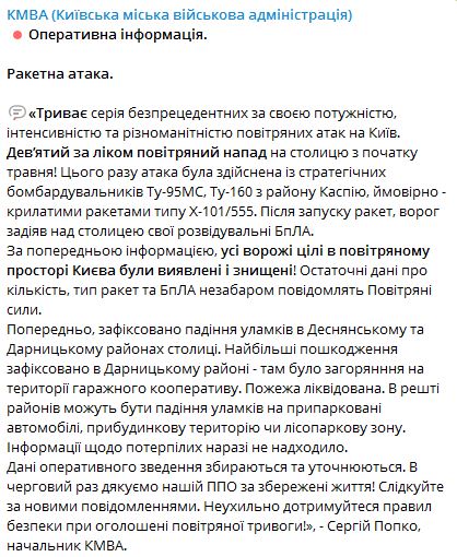 В Киевской военной администрации добавили, что атака осуществлялась со стратегических бомбардировщиков Ту-95МС и Ту-160 из района Каспия, вероятно – крылатыми ракетами типа Х-101.