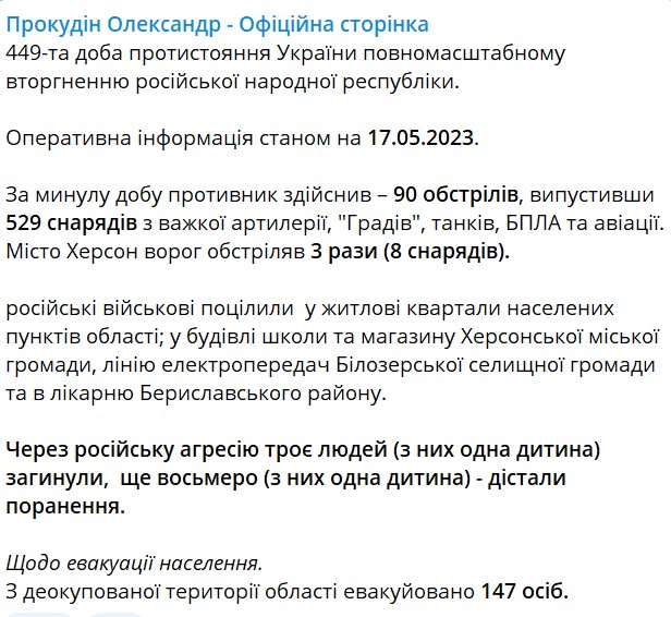 За минувшие сутки россияне 90 раз обстреляли Херсонщину, выпустив по региону 529 снарядов из тяжелой артиллерии, "Градов", танков, БПЛА и авиации.