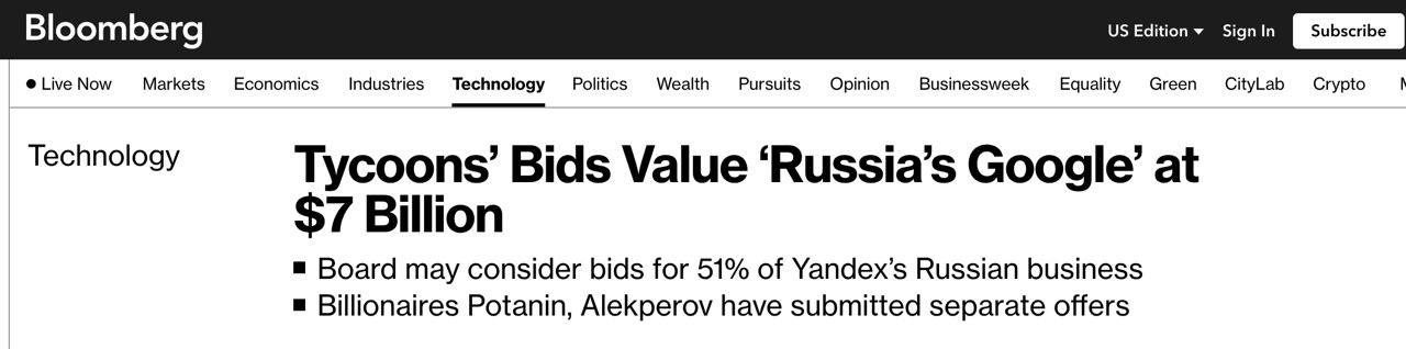 Российские олигархи хотят выкупить контрольный пакет акций "Яндекса" - Bloomberg