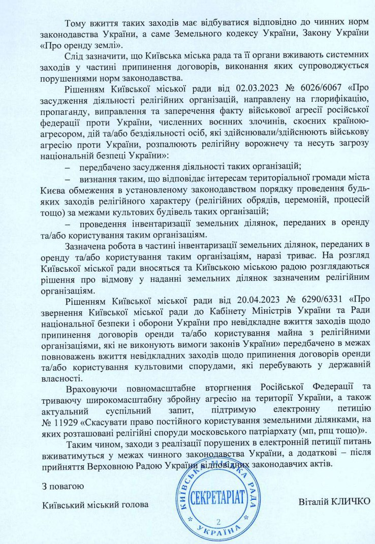 Мэр Киева Виталий Кличко ответил на петицию забрать землю у храмов УПЦ в столице.