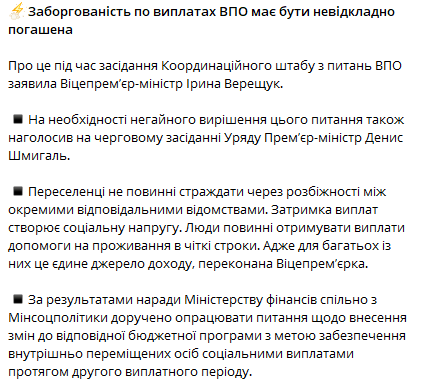 "Переселенцы не должны страдать из-за разногласий между отдельными ответственными ведомствами. Задержка выплат создает социальное напряжение. Люди должны получать выплаты пособия на проживание в четкие сроки. Ведь для многих из них это единственный источник дохода", - заявила вице-премьер Верещук во время заседания Координационного штаба по вопросам ВПЛ.