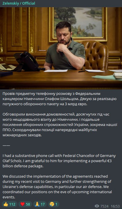 Владимир Зеленский поблагодарил канцлера за предоставление оборонного пакета на три миллиарда евро, и обсудил "исполнение договоренностей, достигнутых во время недавнего визита в Германию", в частности, предоставление Украине средств ПВО.