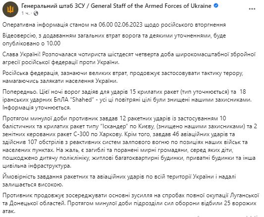 В пятницу, 2 июня, Генштаб ВСУ обнародовал сводку  ситуации на фронте.