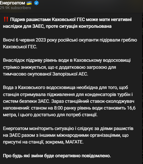 Об этом сообщает "Энергоатом", комментируя разрушение дамбы Каховской ГЭС, из-за чего уровень воды в Каховском водохранилище, где расположена атомная станция, начал падать.