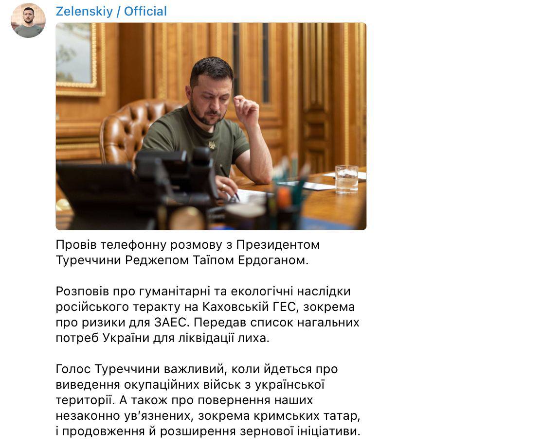 Зеленский пишет, что обсуждали последствия подрыва, он передал Эрдогану список неотложных потребностей Украины для ликвидации бедствия и подчеркнул важность посреднической функции Турции.