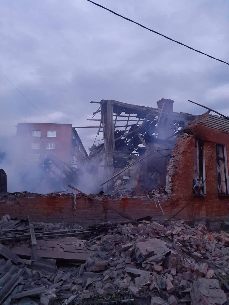 Власти Сумской области пишут, что прилет был по Белопольской общине. Дроны поразили админздание, учебное заведение и производственные помещения.