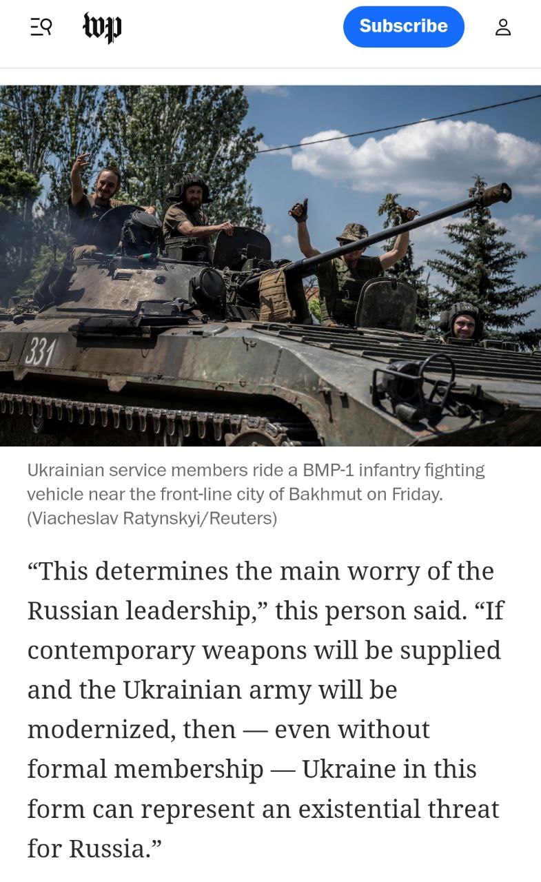 "Это определяет главное беспокойство российского руководства. Если будет поставляться современное вооружение и будет модернизироваться украинская армия, то - даже без формального членства - Украина в таком виде может представлять для России экзистенциальную угрозу", - заявил собеседник издания их дипломатических кругов РФ.