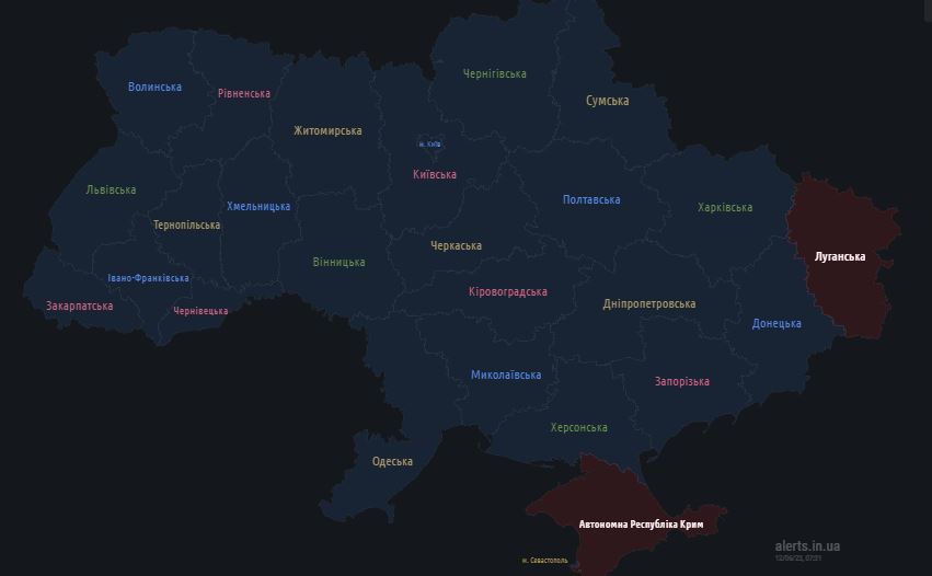07.00 Карта тревог сейчас. Ночью тревога была в Запорожской и Николаевской области.