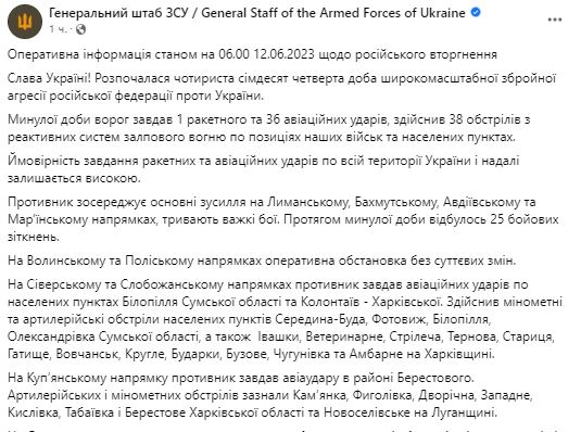1. За прошедшие сутки враг силы РФ нанесли 1 ракетный и 36 авиационных ударов, 38 обстрелов из РСЗО.