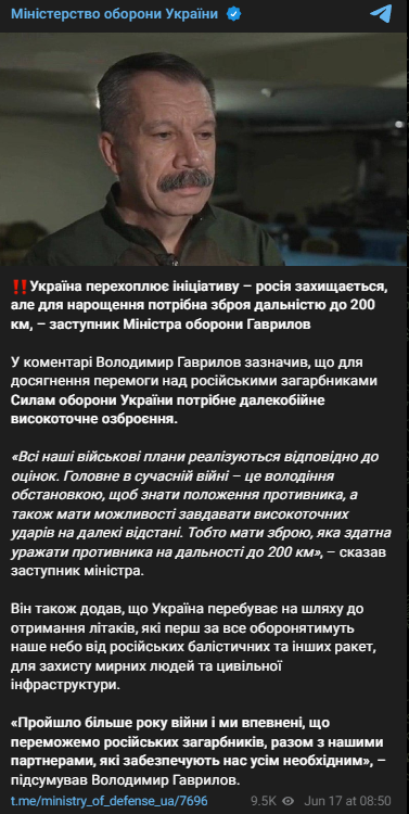 "Украина перехватывает инициативу - Россия защищается, но для наращивания нужно оружие дальностью до 200 километров...Все наши военные планы реализуются в соответствии с оценками. Главное в современной войне - это владение обстановкой, чтобы знать положение противника, а также иметь возможности наносить высокоточные удары на дальние расстояния. То есть иметь оружие, которое способно поражать противника на дальности до 200 км", - заявил он.